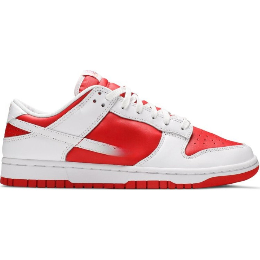 The ND Low 'Championship Red' features a simple two-tone color blocking reminiscent of the original 1985 'Be True to Your School' series. The leather upper combines a crimson base with contrasting white overlays on the forefoot and heel. Standard Nk branding appears on the insole, heel tab, and woven tongue label. The sneaker sits atop a traditional rubber cupsole, highlighted by white sidewalls and a grippy red rubber outsole.